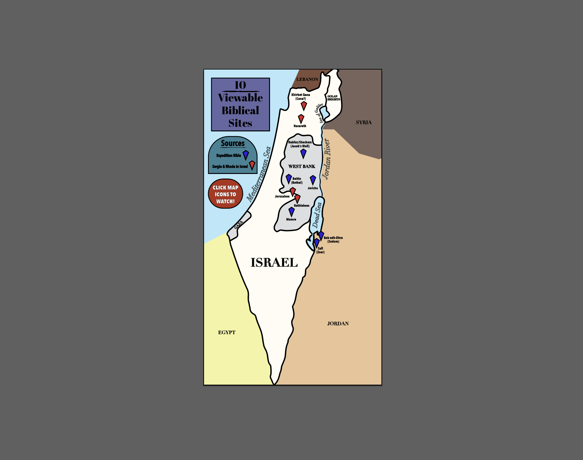 For this project I was given the task of creating any of map of my choosing, in Illustrator, and chose to make one that highlights important Biblical archeological sites. Each location marker on the map is specific to the labeled site/area and is fully interactive (available within the PDF linked down below) and clicking the markers will show you footage of the actual site via links to various YouTube videos created at that location by either Sergio and Rhoda in Israel, or Expedition Bible.